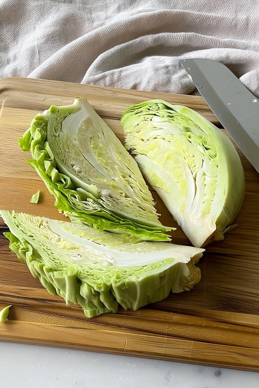 - Begin by cutting the cabbage into 4 wedges, about 1-inch thick. The thicker pieces help retain moisture while crisping.