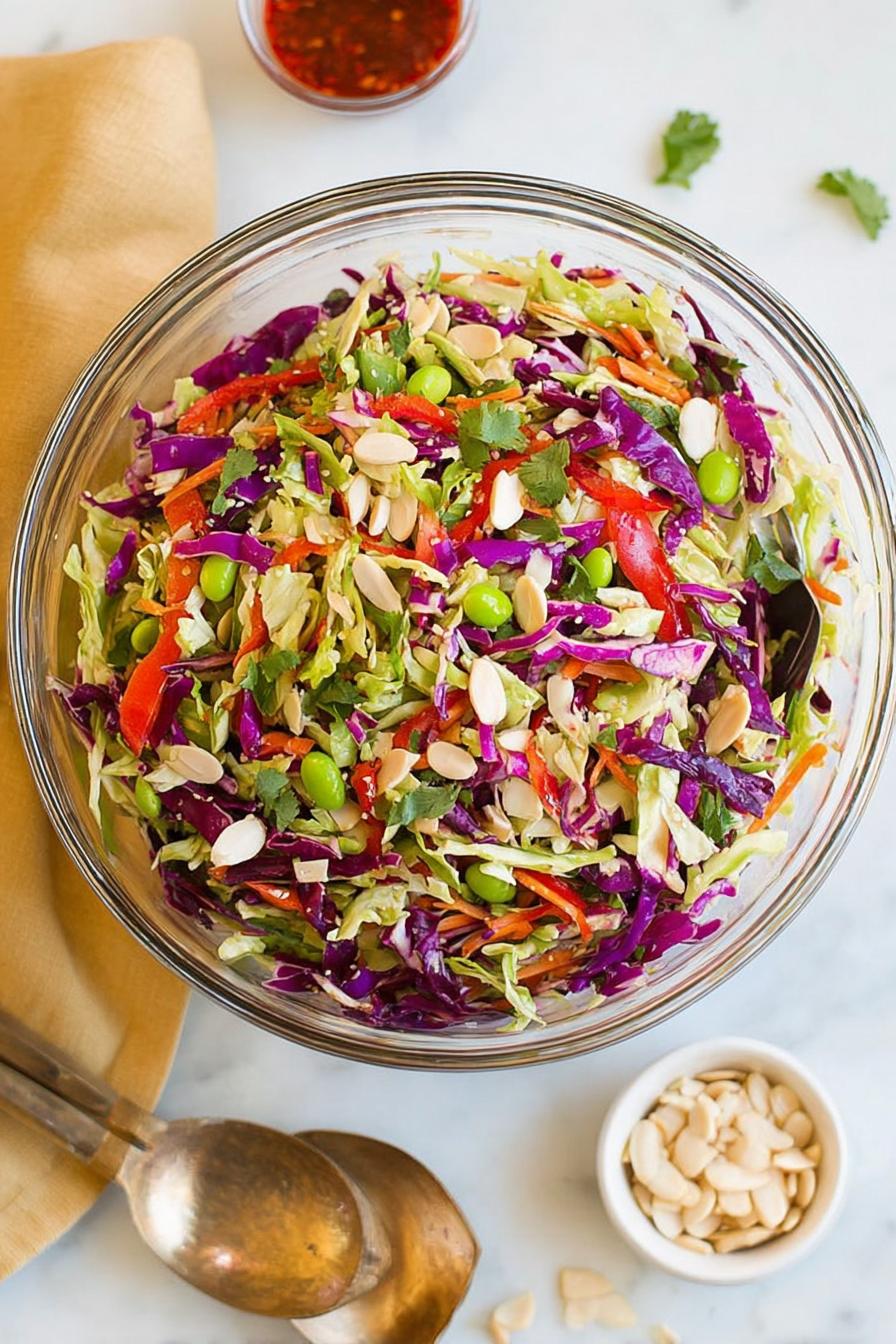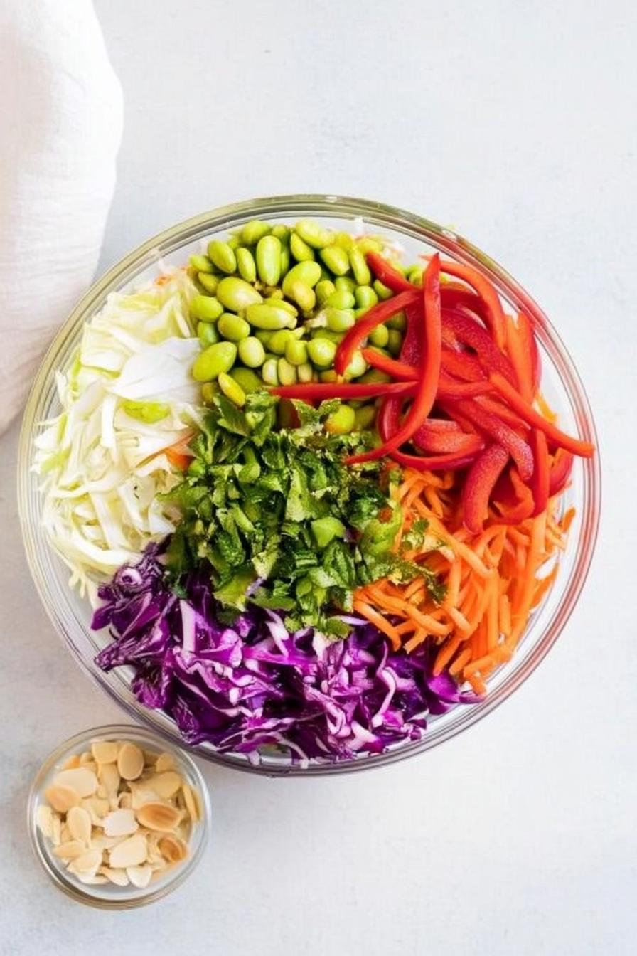 - In a large mixing bowl, combine the finely sliced green and red cabbage, thinly sliced red bell pepper, shredded carrots, thawed edamame, and chopped cilantro, creating a vibrant base that’ll catch anyone’s eye.
