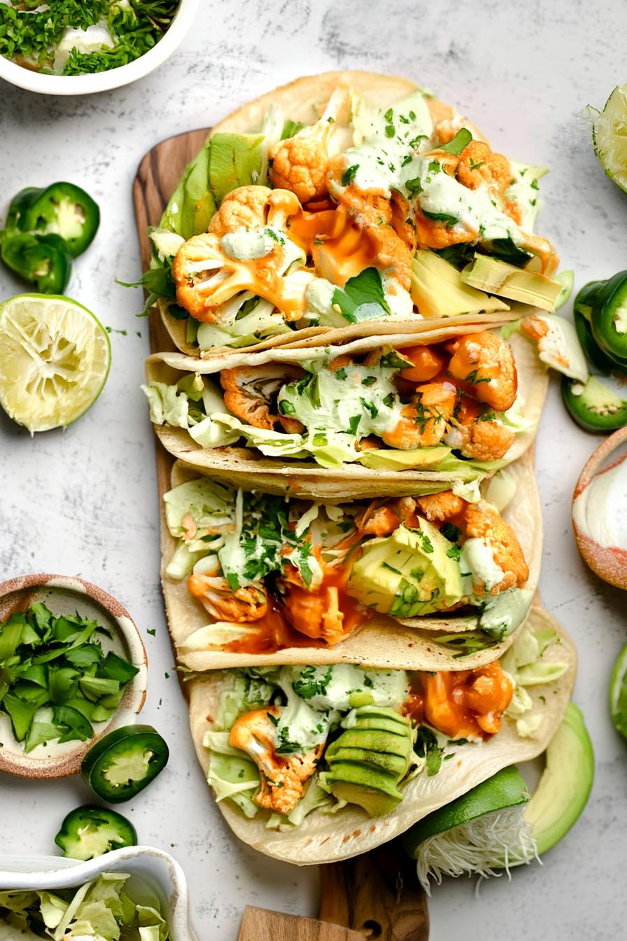 - While the cauliflower is roasting, prepare the tortillas and toppings. Once the cauliflower is ready, assemble your tacos with cabbage, avocado, and a drizzle more of Buffalo sauce.