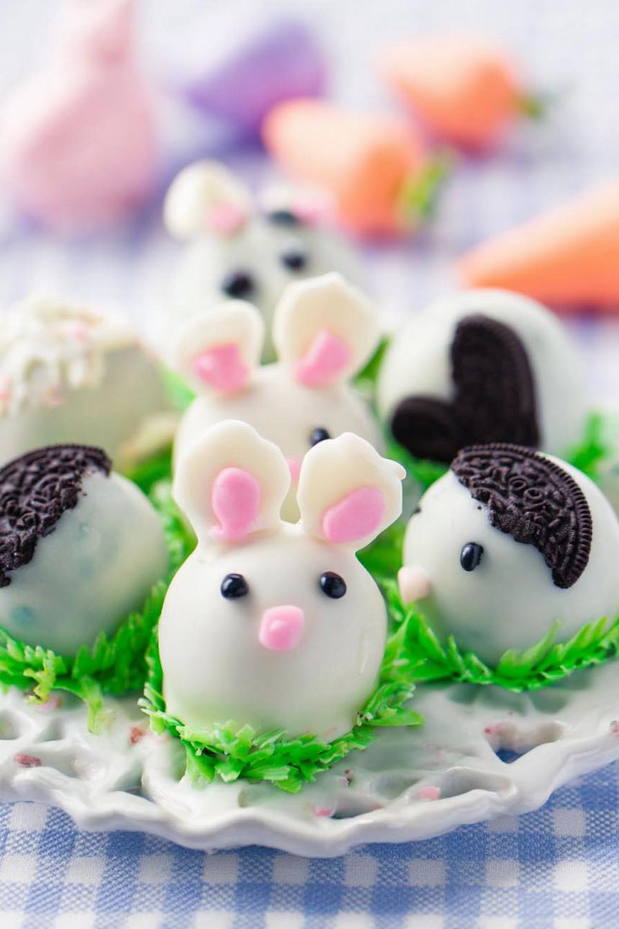- Melt white chocolate according to package directions. Dip OREO balls into chocolate and shake off excess. Place on a lined baking sheet and decorate one at a time with bunny decorations.16 oz white chocolate melting wafers, Candy Bunny Decorations