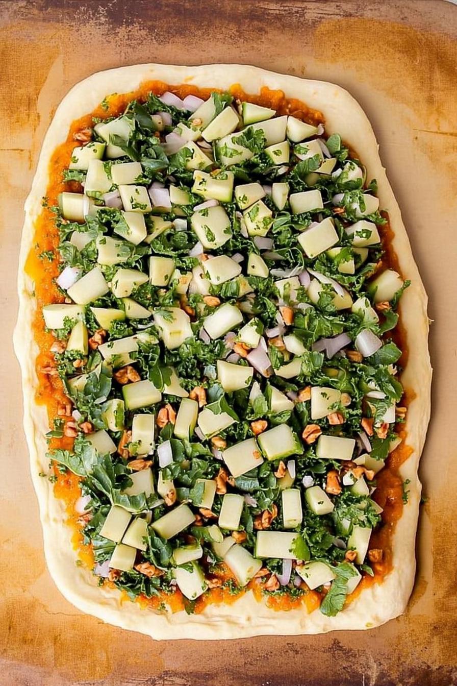 - Spread the roasted squash in a thin layer, leaving a ½-inch border. Sprinkle mozzarella (½ cup), then arrange apple slices on top so they slightly overlap—this creates soft “petals” that crisp at the tips.