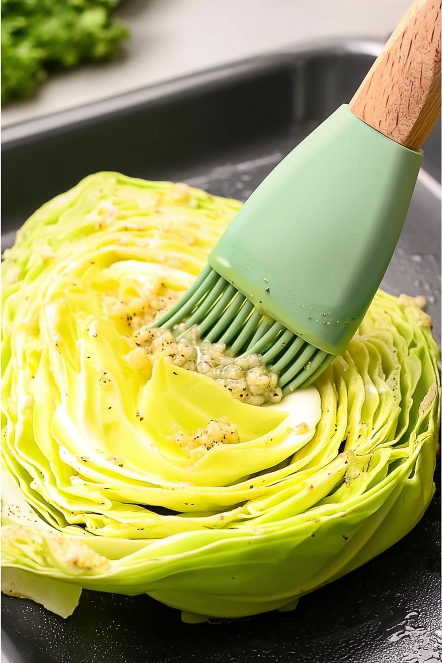 3. In a small bowl, mix the olive oil, minced garlic, kosher salt, and pepper. Brush this mixture generously on both sides of the cabbage slices, ensuring every inch gets a bit of flavor. Pop them into the oven for about 26 to 28 minutes until the edges are nice and crispy, and the centers are tender.