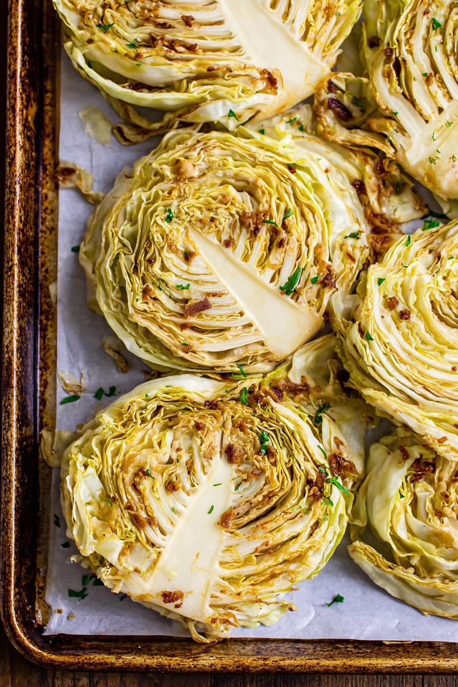 Crispy and delicious Cabbage Steaks, roasted with garlic and olive oil for a wholesome side dish.