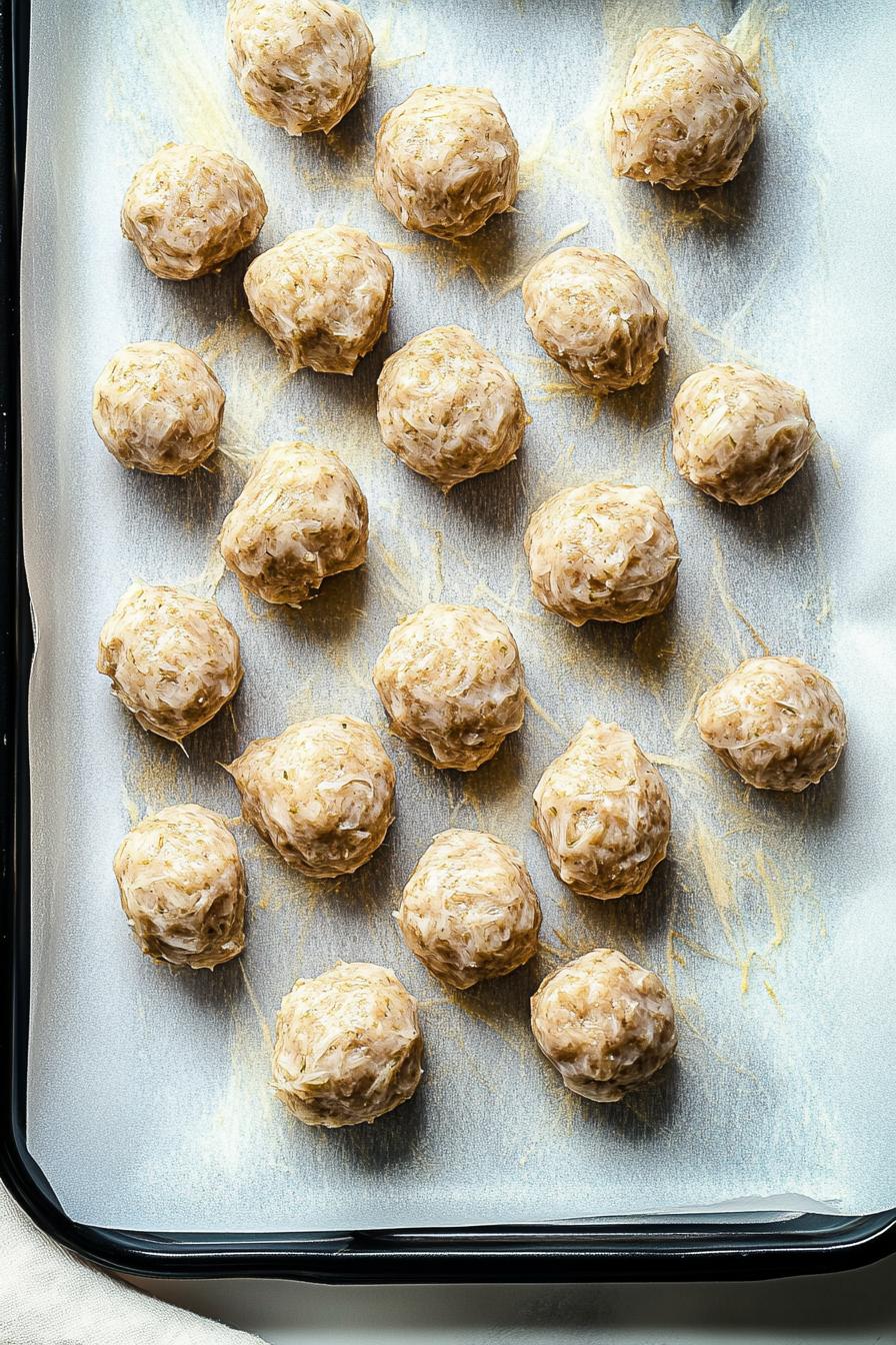 - Use a cookie scoop or your hands to form the mixture into meatballs, about 1½ tablespoons each. Place the meatballs on the prepared baking sheet, spacing them about 1 inch apart.