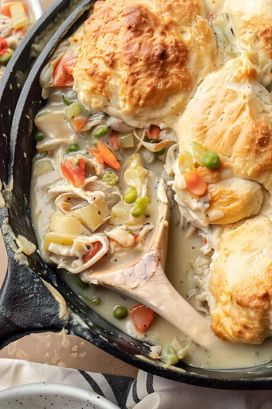 - Can I make Chicken Pot Pie with Biscuits ahead of time? Yes—assemble up to the biscuit step, cover, and refrigerate. Add biscuits and bake when ready.