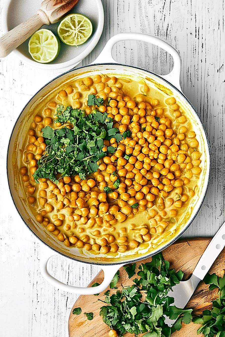 - Add chickpeas and coconut milk, simmering for 10 minutes.