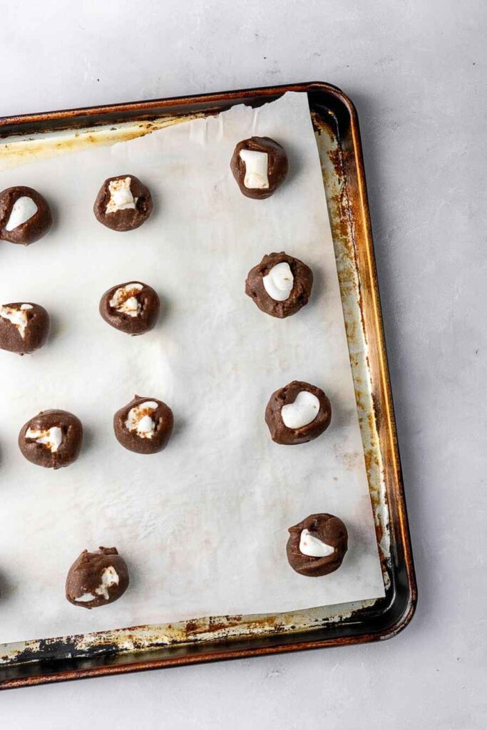 - Quickly press about 2 tablespoons mini marshmallows and 1 tablespoon semisweet chocolate chips into each warm cookie. Return to oven 3–4 minutes until marshmallows puff and chips turn glossy.