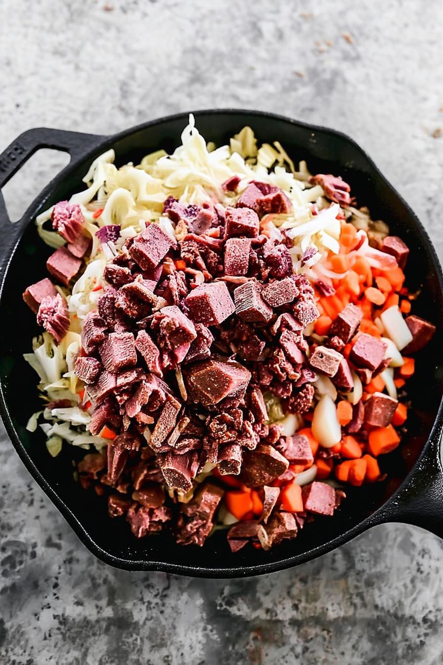 • Corned Beef: The star of the dish, adds richness; leftovers from dinner work perfectly here.
