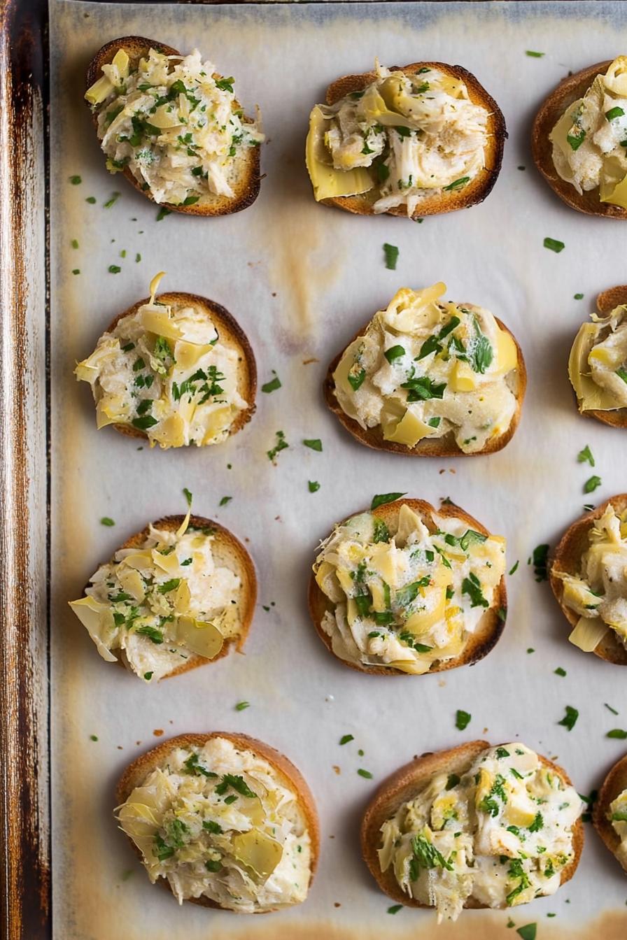 - Spoon 1 heaping tablespoon of the artichoke-crab mixture onto each baguette slice. Broil until the cheese begins to melt, about 3 minutes. Watch very carefully the entire time so that the toasts do not burn. Sprinkle with the remaining 1 tablespoon fresh parsley. Serve warm or at room temperature.