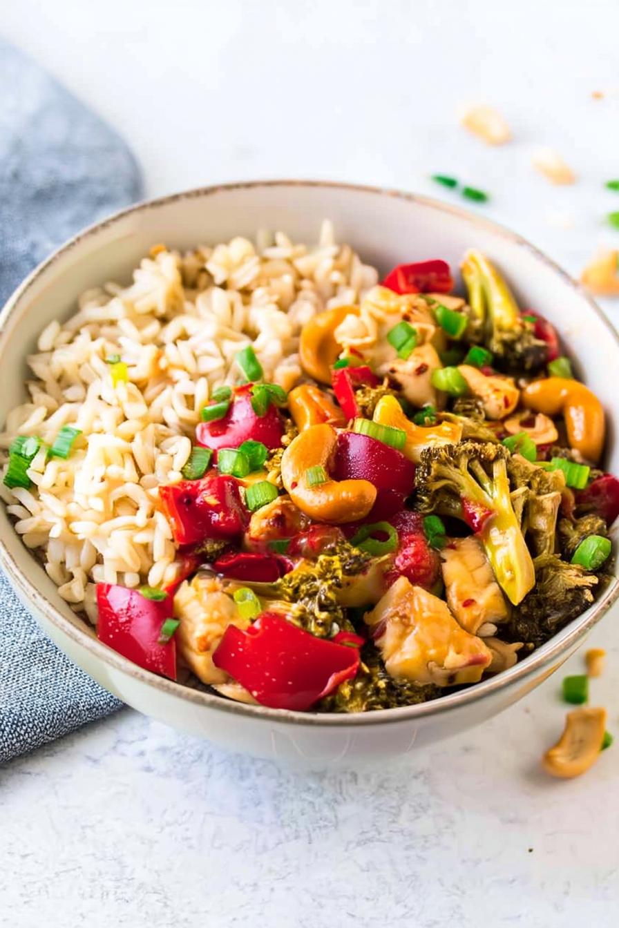 - Add the sauce back to the slow cooker with chicken and vegetables. Stir in cashews and sprinkle with reserved green onions. Serve hot with brown rice or quinoa.1.75 pounds boneless skinless chicken breasts or thighs