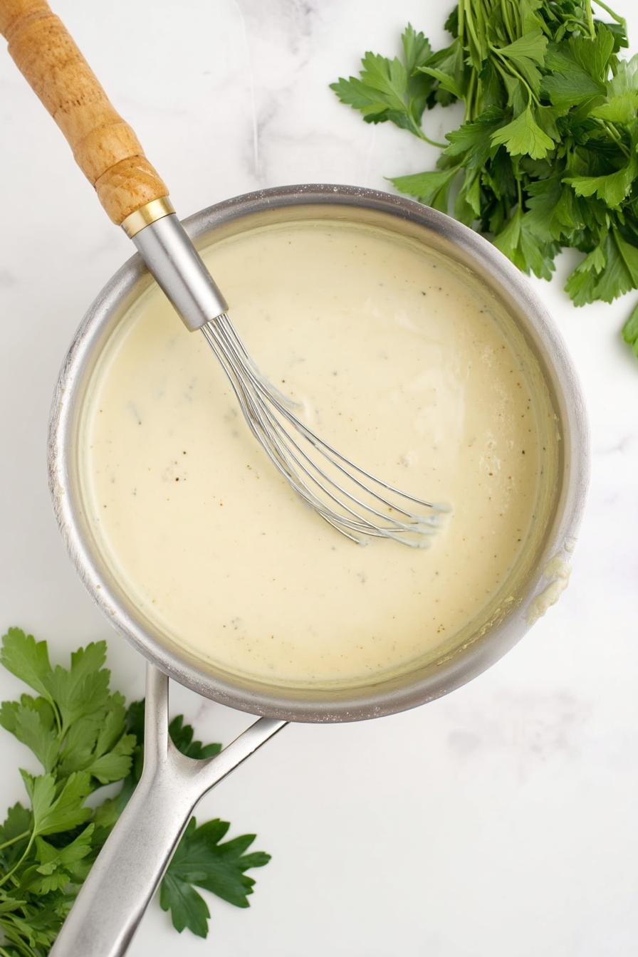 - Whisk in the cream of chicken soup, softened cream cheese, Italian dressing mix, chicken broth, and optional white wine until smooth—this should take about 3-5 minutes.