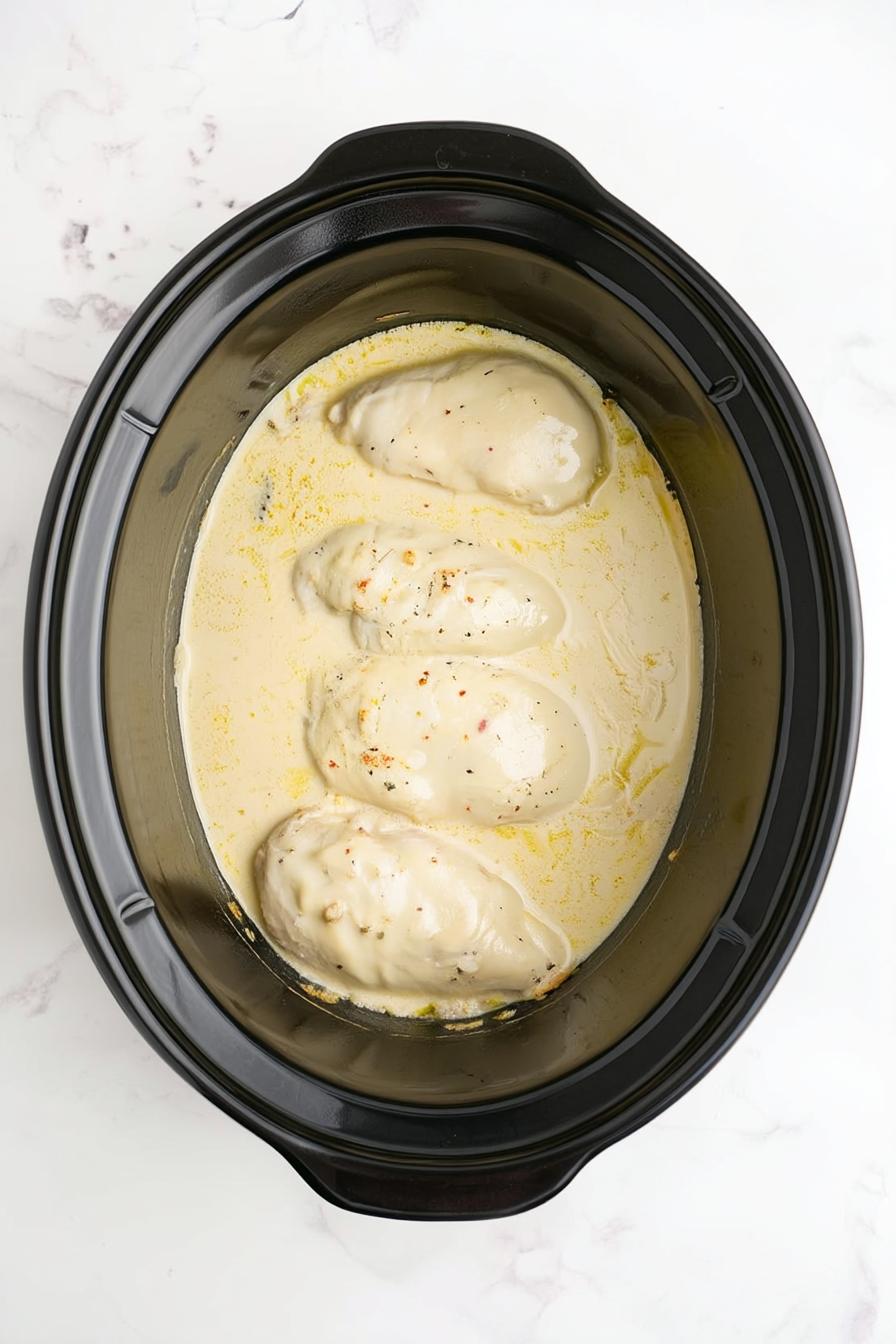 - Arrange the chicken breasts at the bottom of the slow cooker, ensuring they’re evenly spaced.