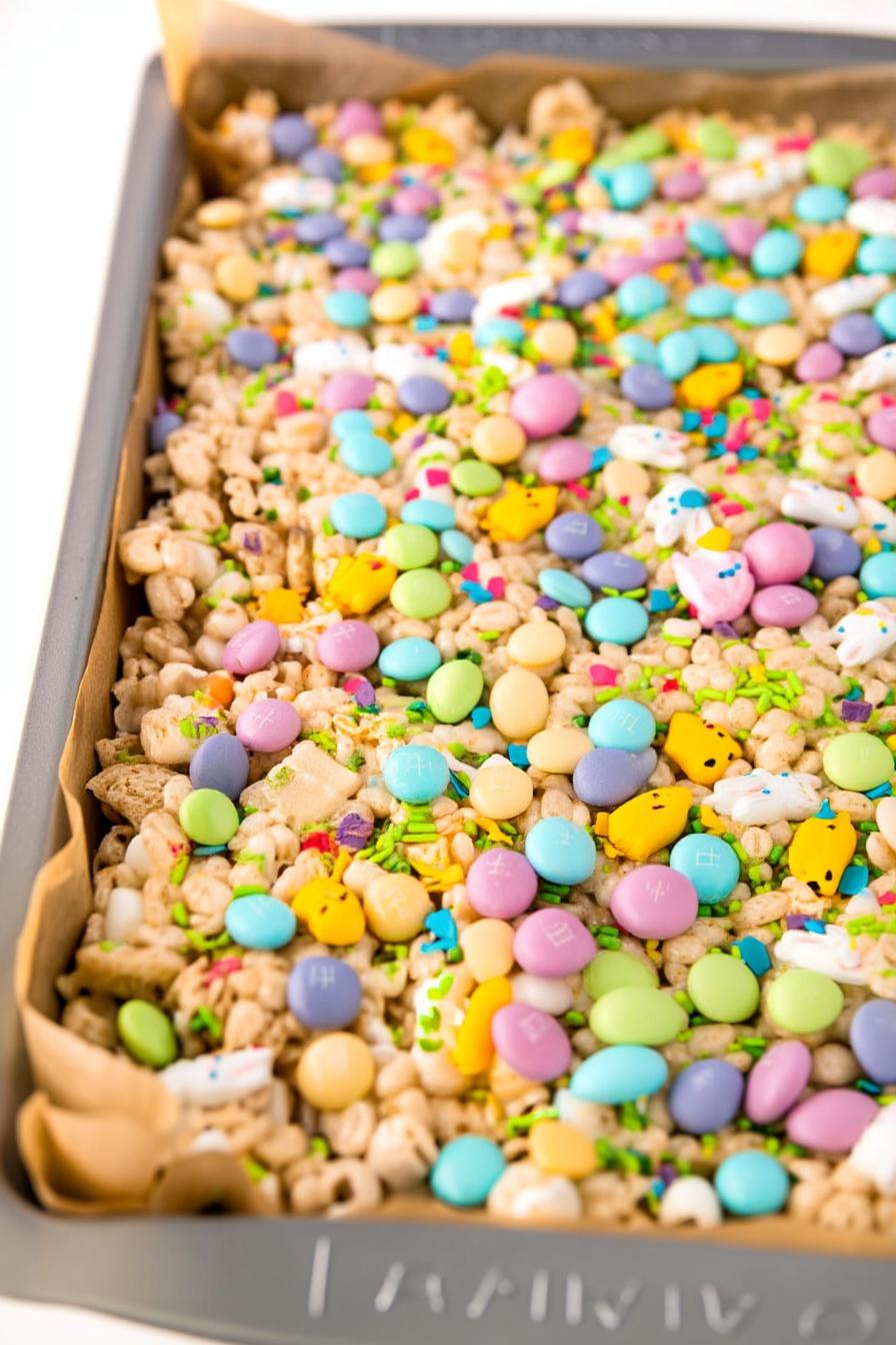 • Top with extra M&Ms and sprinkles, if desired, and use parchment paper or greased hands to gently press the mixture into the pan. Allow to set for 30 minutes before removing from the pan and cutting into squares.