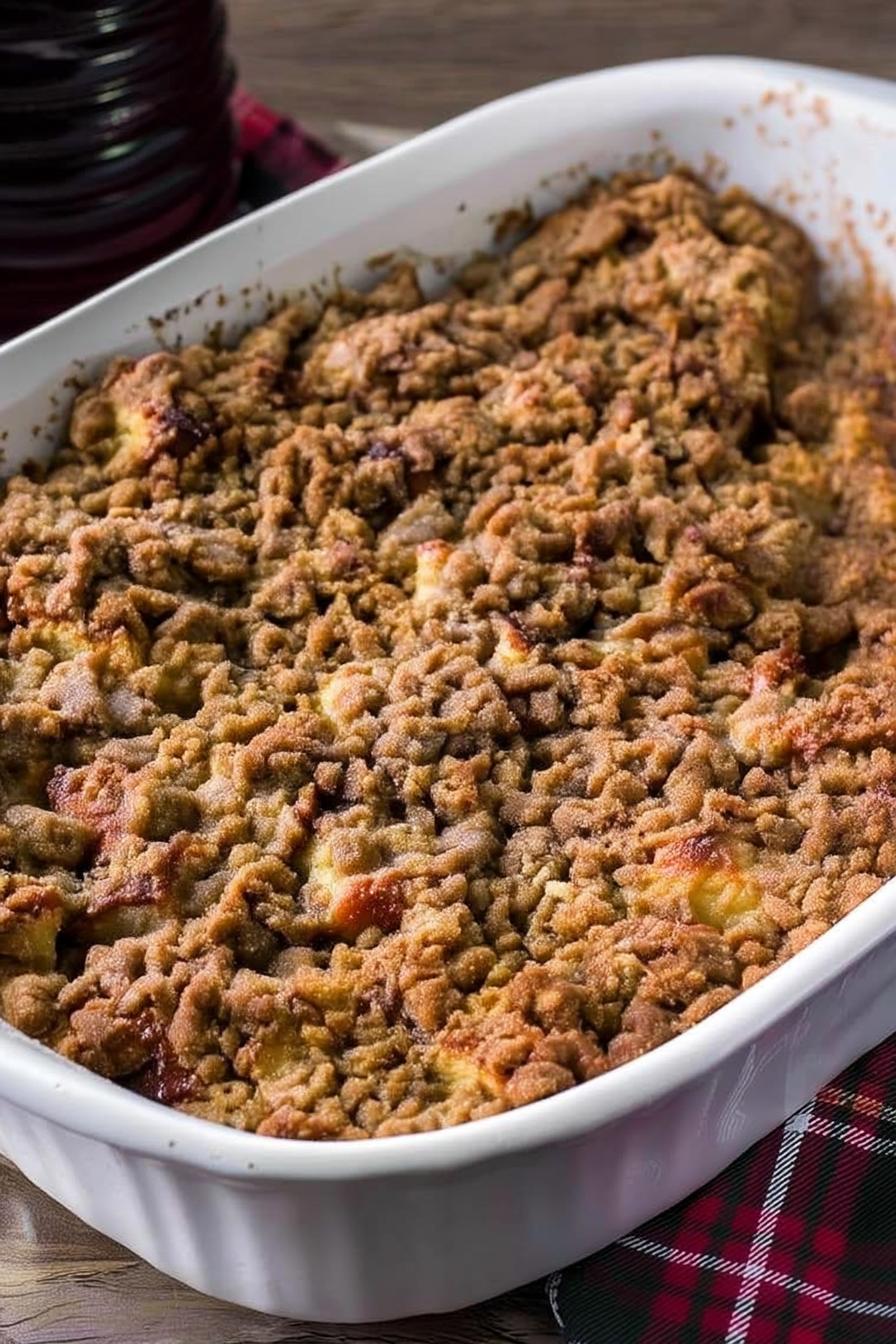 - Remove the dish from the fridge, sprinkle the streusel evenly on top, and bake uncovered for 45–55 minutes until golden and set.