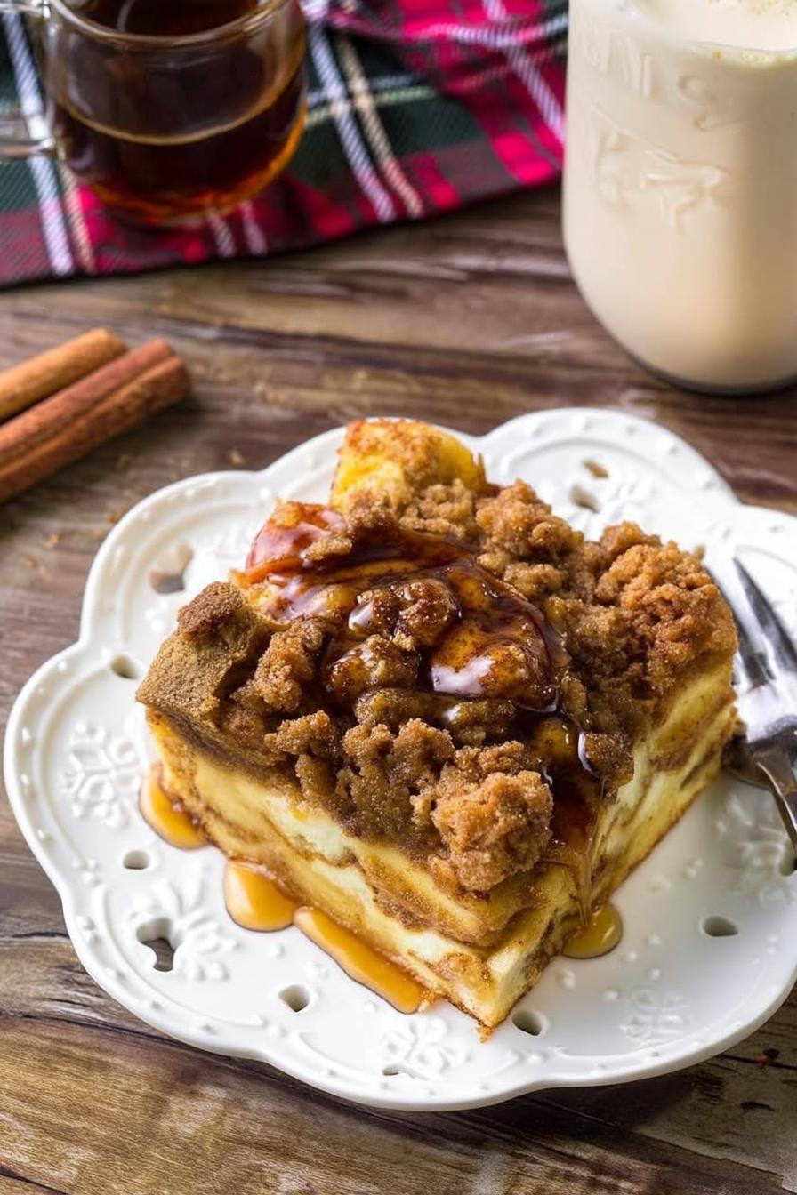 - Cinnamon Roll French Toast – indulgent cinnamon swirls complement eggnog flavors