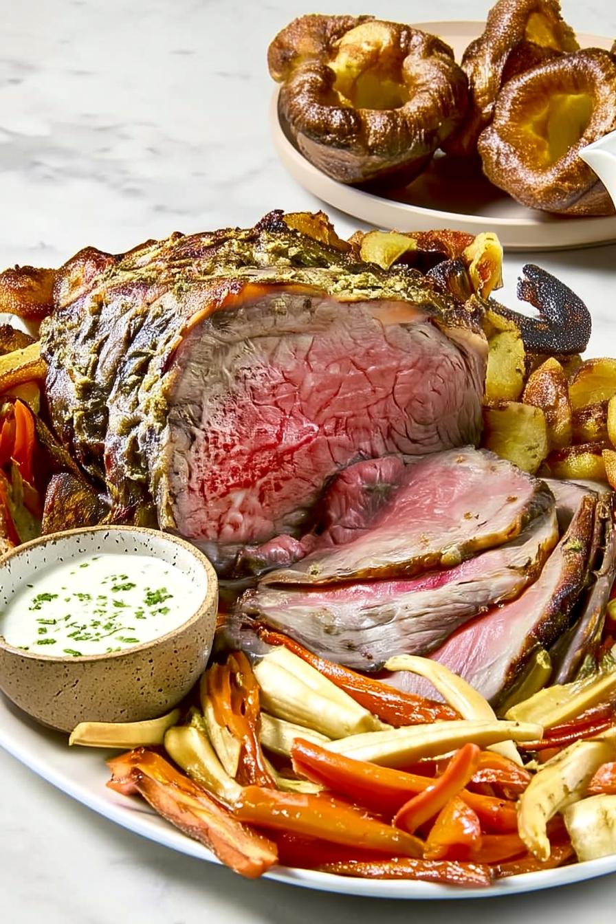 A classic English Sunday Roast featuring a herb-crusted bone-in rib roast with garlic and rosemary for a tender, juicy interior and crackling crust.