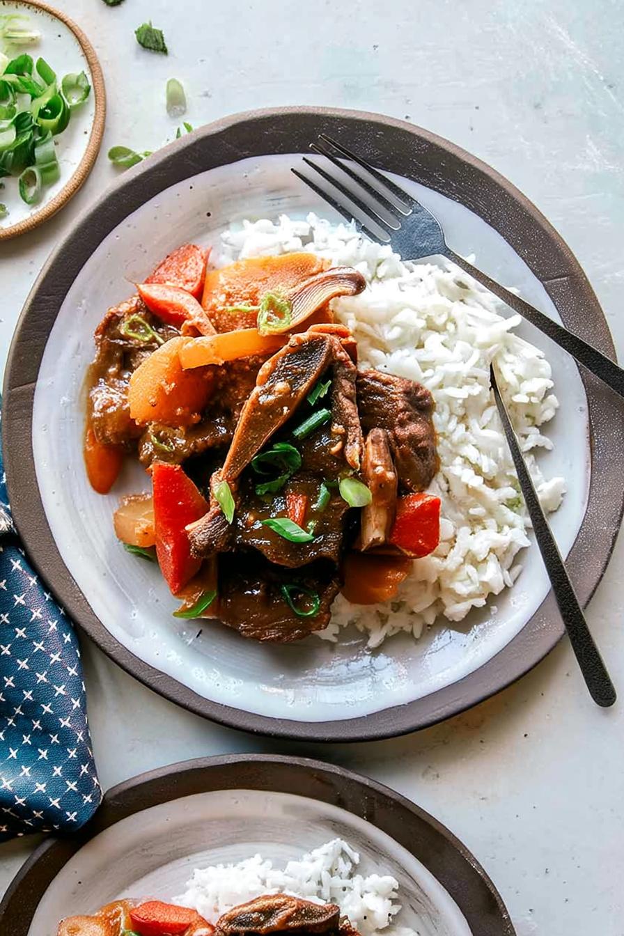 - Cover, reduce heat, and simmer for 1½ hours until ribs are silky smooth. Add 3 chopped carrots and 3 potatoes; simmer uncovered 20–30 minutes until tender. Stir in 4 scallions during the last 5 minutes.