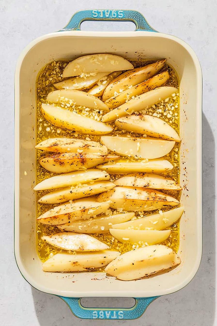 - Place potato wedges in the oiled baking dish, sprinkle with spice mix, and toss to evenly coat.