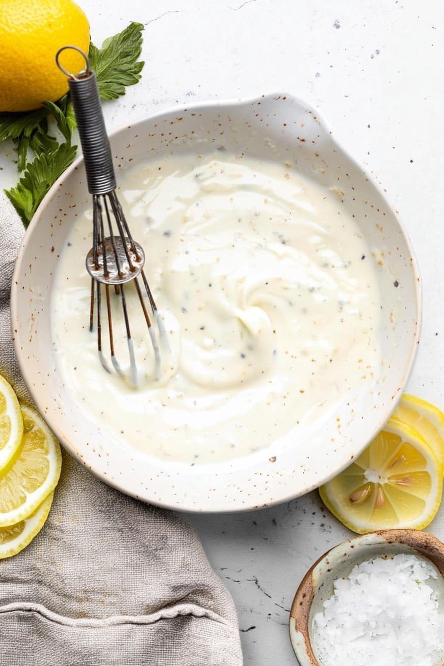 1. In a large bowl, whisk together ½ cup plain Greek yogurt, ¼ cup mayonnaise, 1 Tbsp fresh lemon juice, 1 tsp Dijon mustard, and a pinch of salt and pepper until smooth.