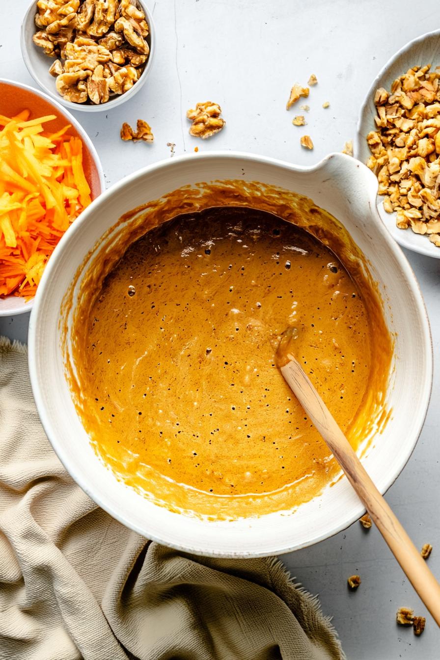 • Gradually add dry ingredients, mixing until just combined. Stir in carrots, walnuts, and pineapple.