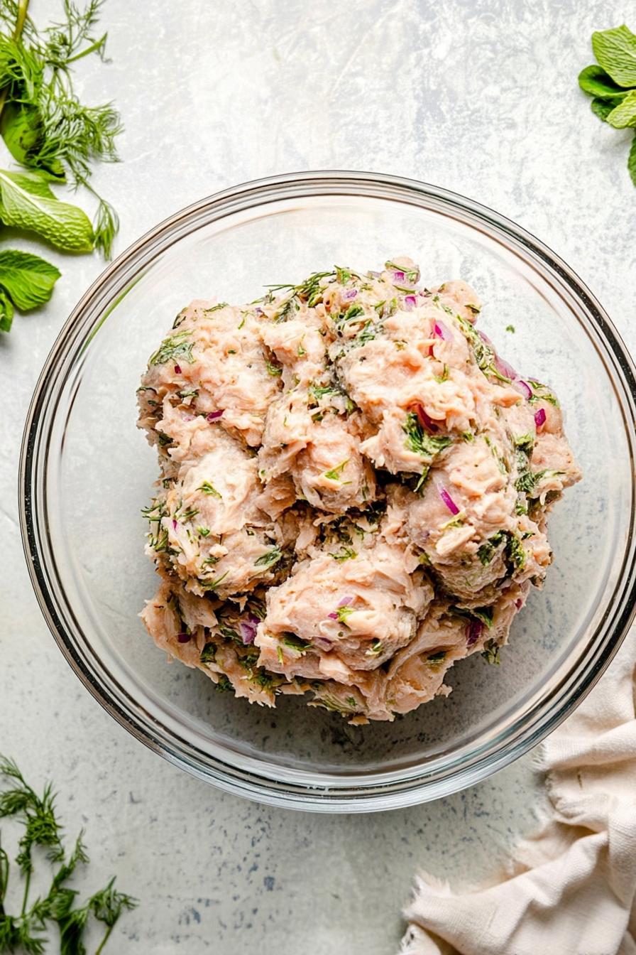 1. In a large bowl, combine ground chicken, finely chopped herbs, and minced garlic. Mix until just combined to avoid toughness.