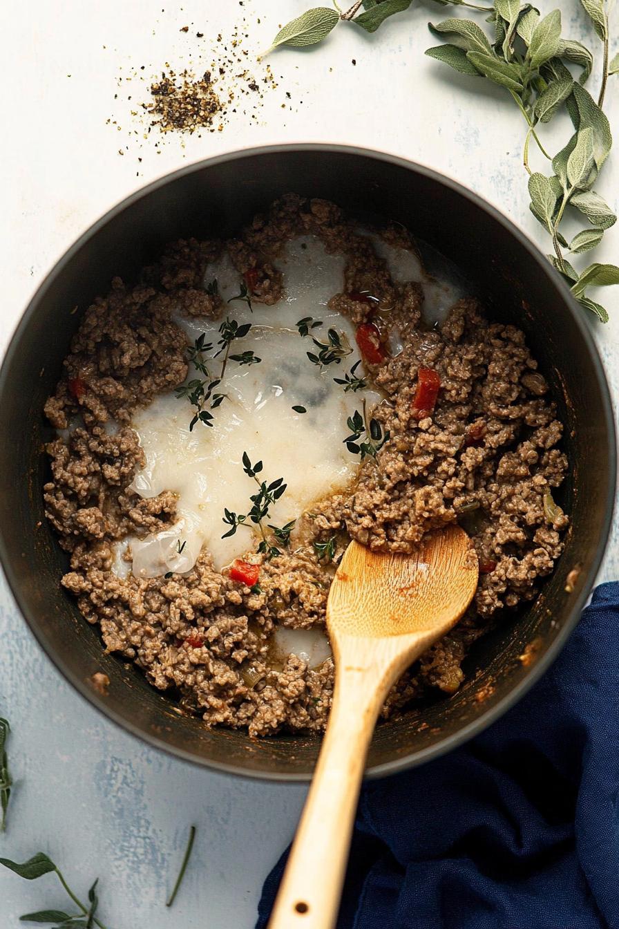 - Add ground beef; cook, breaking it up with a spoon, until no longer pink, about 5 minutes. Stir in Italian seasoning, oregano, salt, and black pepper; cook for 1 minute.