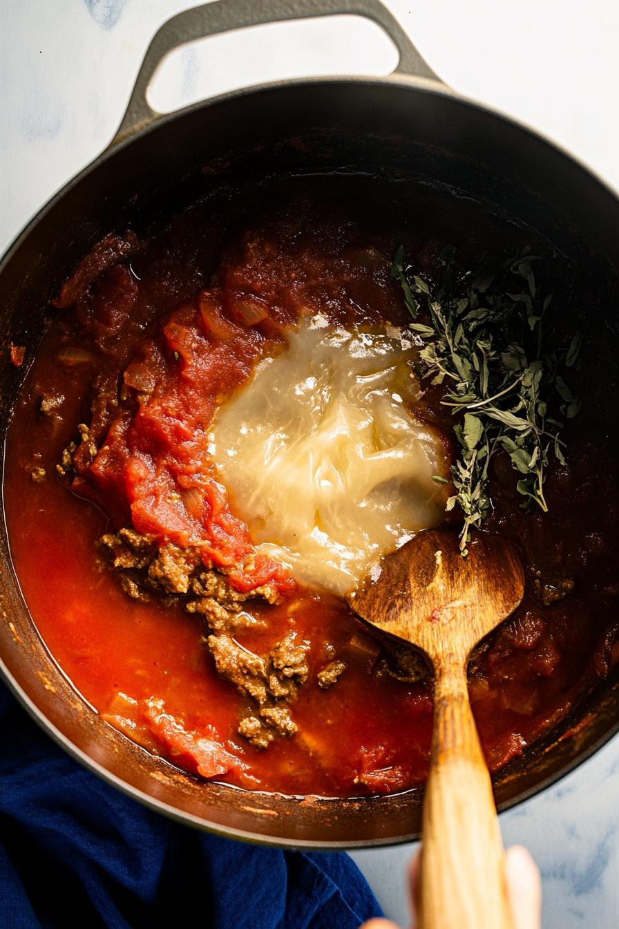 - Pour in crushed tomatoes and beef broth; bring to a boil.