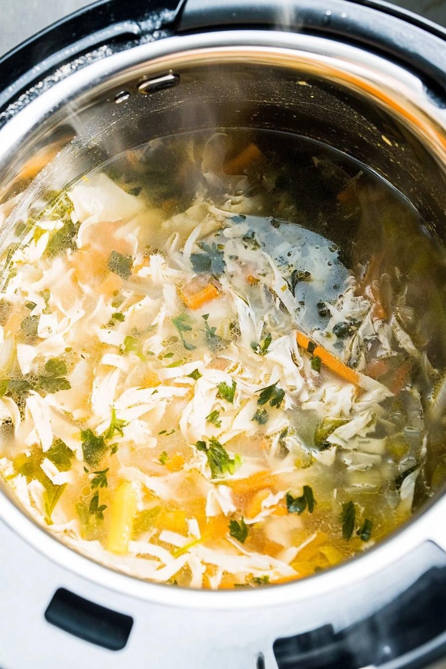 - Remove the chicken, shred it, then stir in the noodles and cook on sauté mode until tender, about 5 minutes.