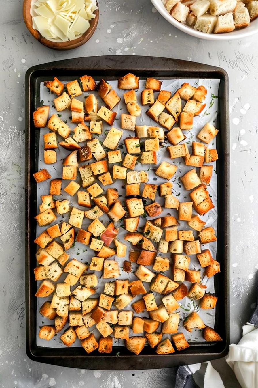 - Add the toasted croutons and Parmesan cheese, then toss gently to combine.