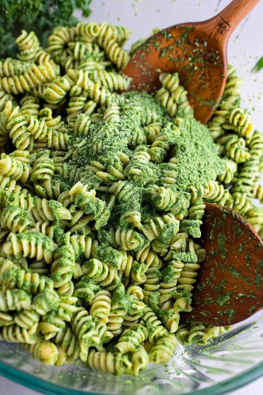 - Toss the hot pasta with kale pesto, adding reserved pasta water if needed.