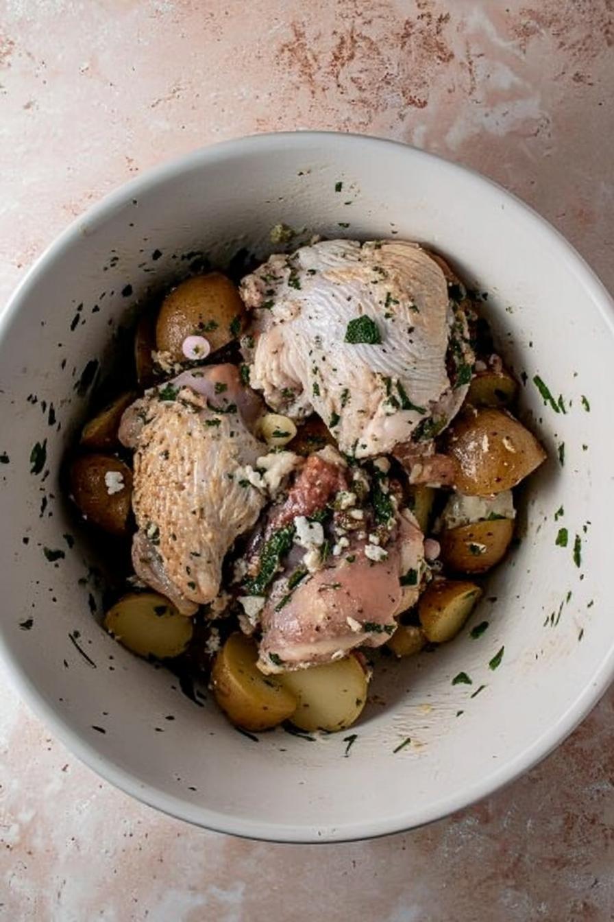 • Toss chicken thighs and parboiled potatoes in the marinade until well-coated.