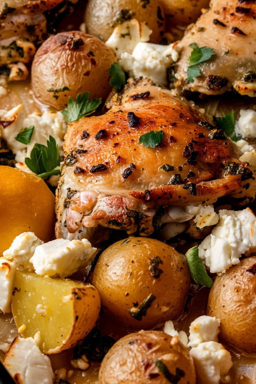 6. Roast in the oven for 45-55 minutes, until the chicken is crispy and fully cooked. Halfway through, sprinkle feta over the dish, letting it warm and soften beautifully.