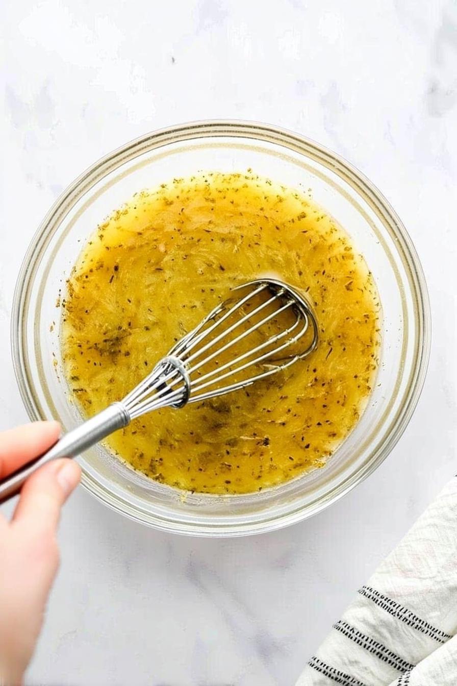 - Slowly pour olive oil into the bowl while whisking until emulsified.