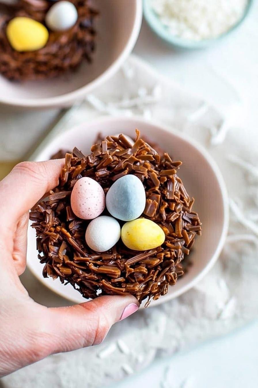 - Can I use sweetened coconut instead of unsweetened? You can, but it may make the nests stickier and sweeter—cut chocolate slightly to balance.