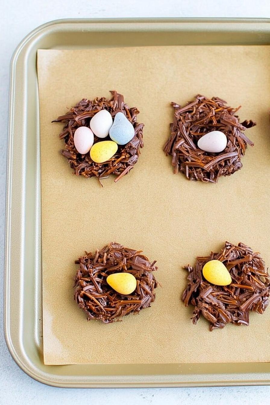 - Spoon 2-3 tablespoons of the mixture onto parchment paper, shaping into a nest. Top each with 2-3 mini eggs.