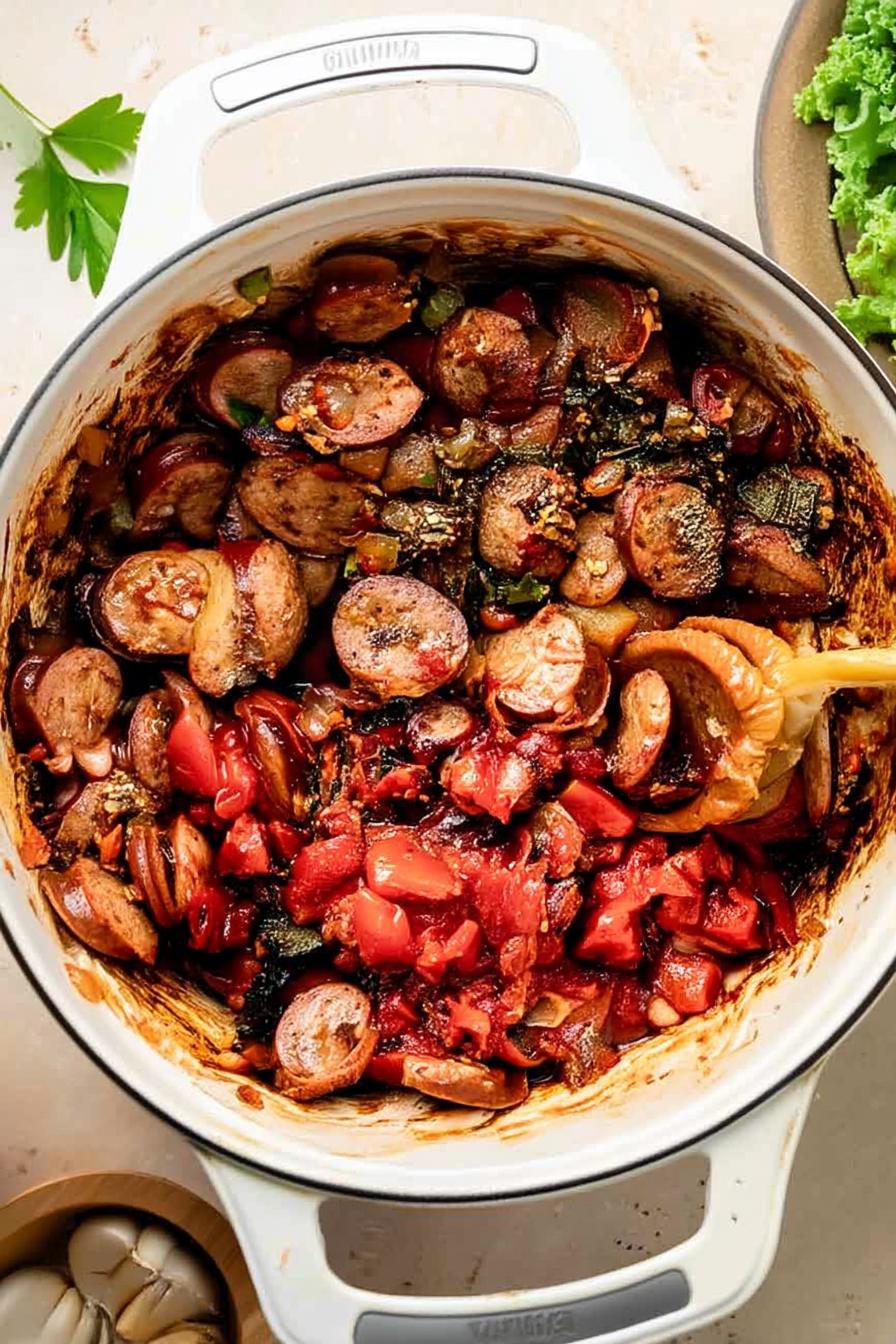 - In a large pot, heat some olive oil over medium heat. Add sliced sausage and sauté until browned, about 5 minutes.