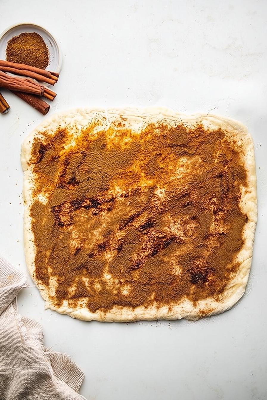 - Brush the melted butter evenly over the surface of the dough. Sprinkle the dough with sugar and cinnamon, ensuring an even layer.