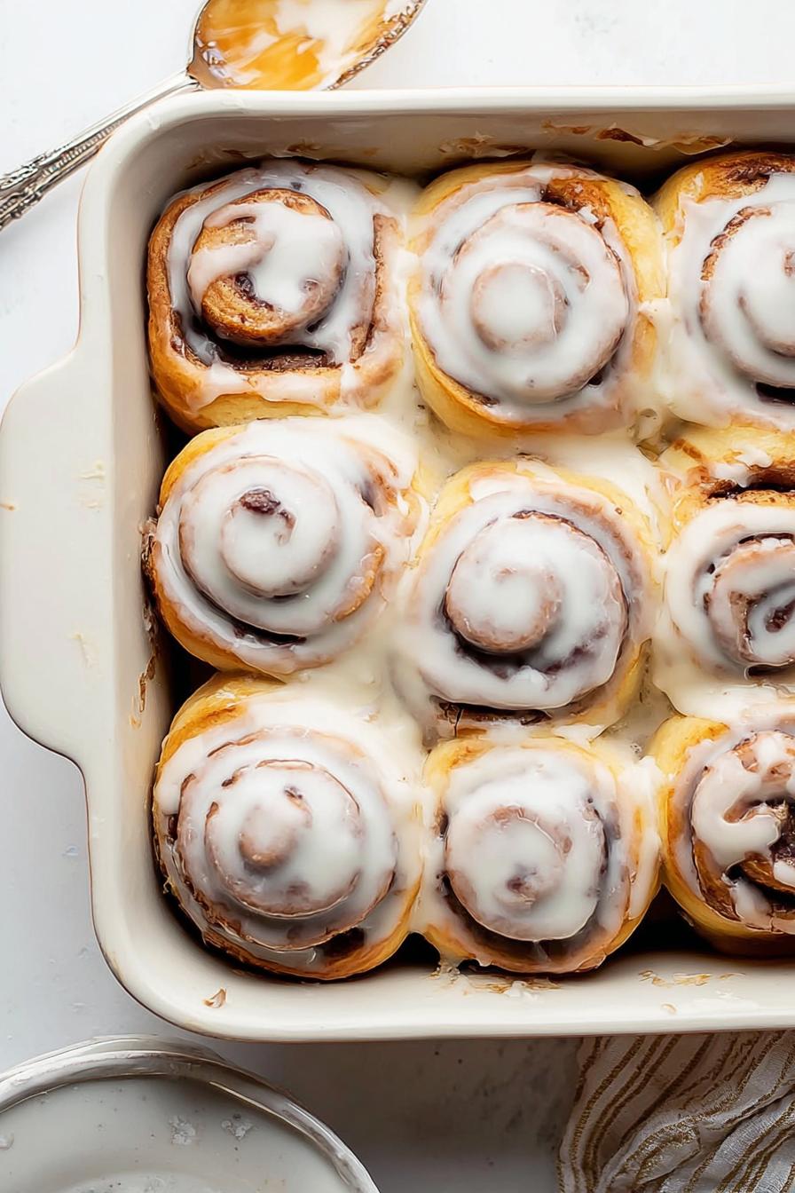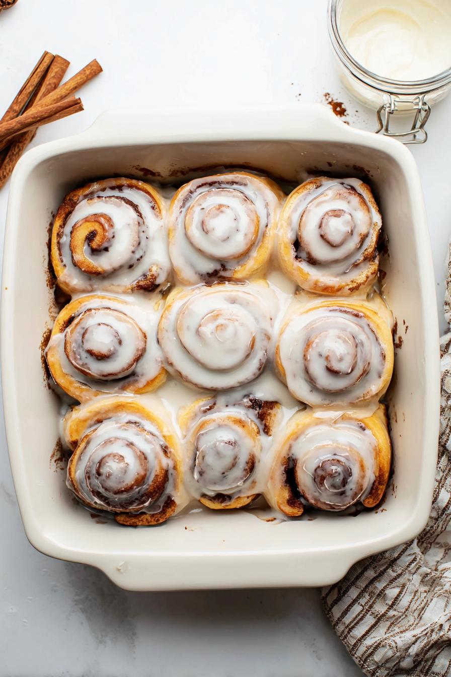 - Let the cinnamon rolls cool for 5-10 minutes before drizzling the glaze over the top. Serve warm and enjoy!