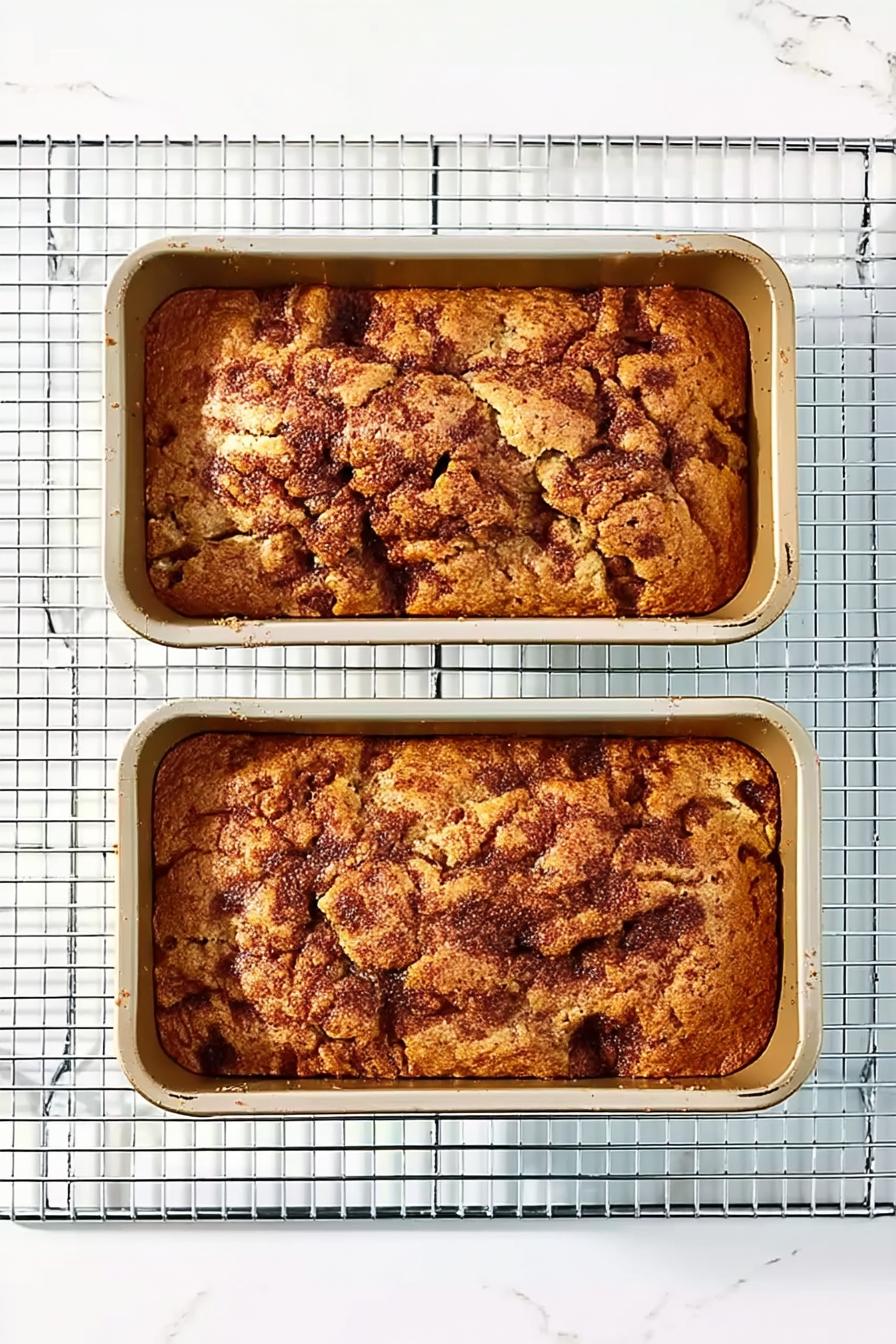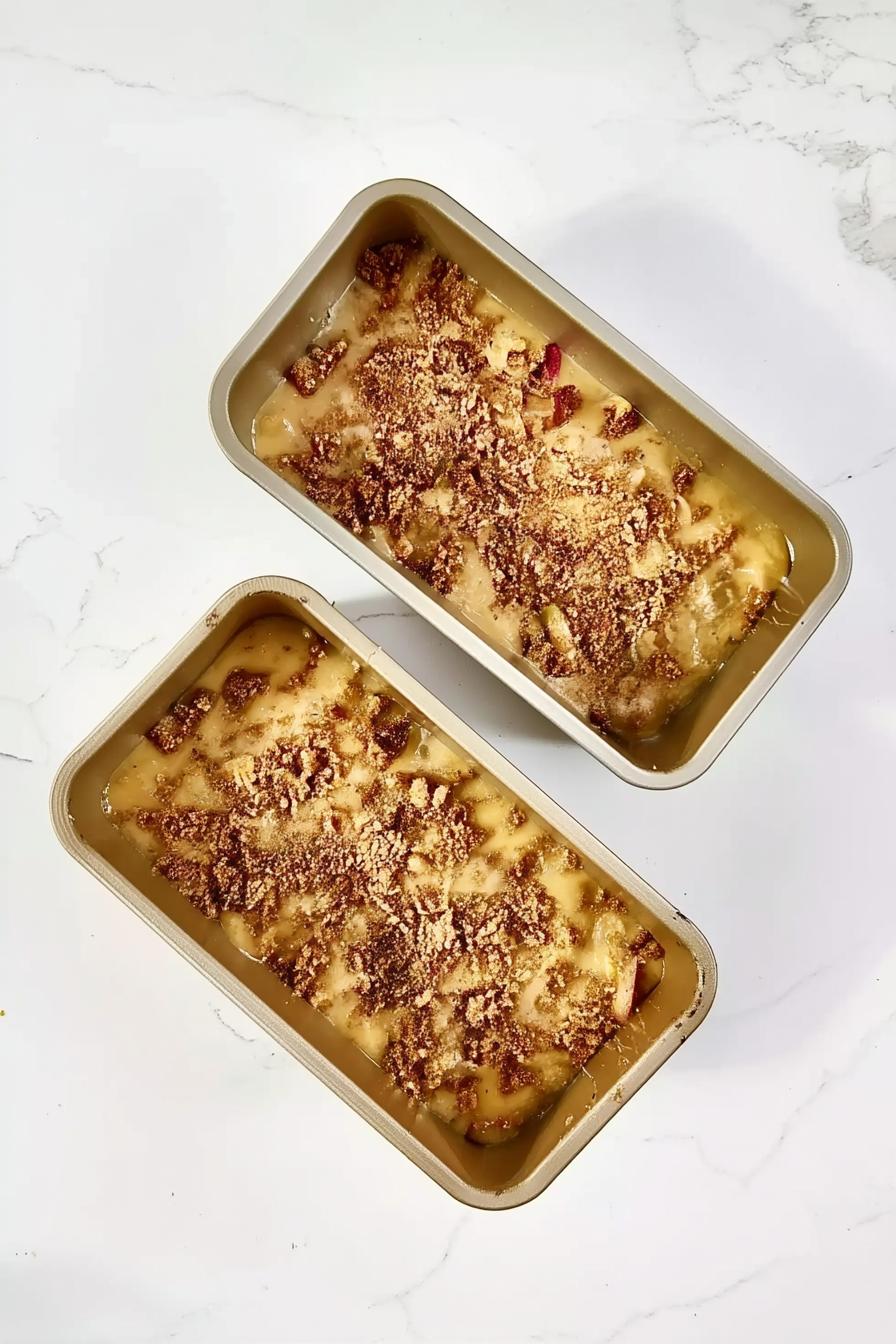 - Pour batter into prepared loaf pans. Combine remaining 1/4 cup brown sugar, butter, and cinnamon in a small bowl. Sprinkle this mixture over the unbaked loaves.