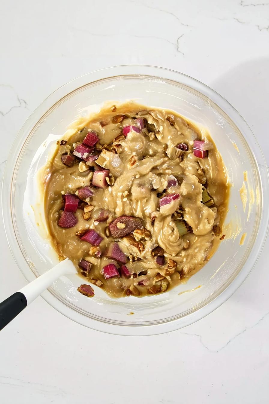 - In a large mixing bowl, blend 1 ½ cups of brown sugar with the vegetable oil and egg until creamy. Gradually combine the flour, salt, and baking soda. Alternate mixing in the milk mixture until just combined, then fold in the chopped rhubarb and walnuts.