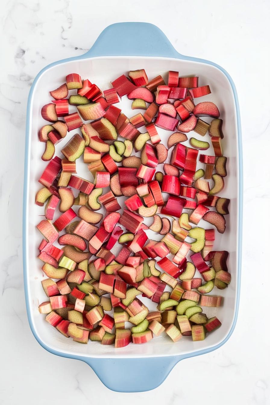 - Spread chopped rhubarb evenly over the bottom of the prepared dish.