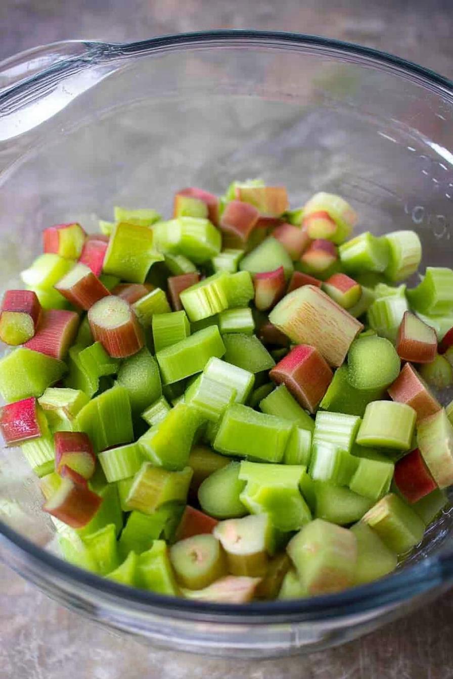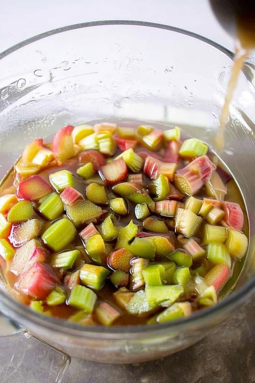 - Begin by placing the rhubarb in a large glass bowl. Sprinkle the sugar over, stirring well to coat. Let it sit covered for at least 8 hours, stirring once or twice. This draws out the juices and begins the maceration process.