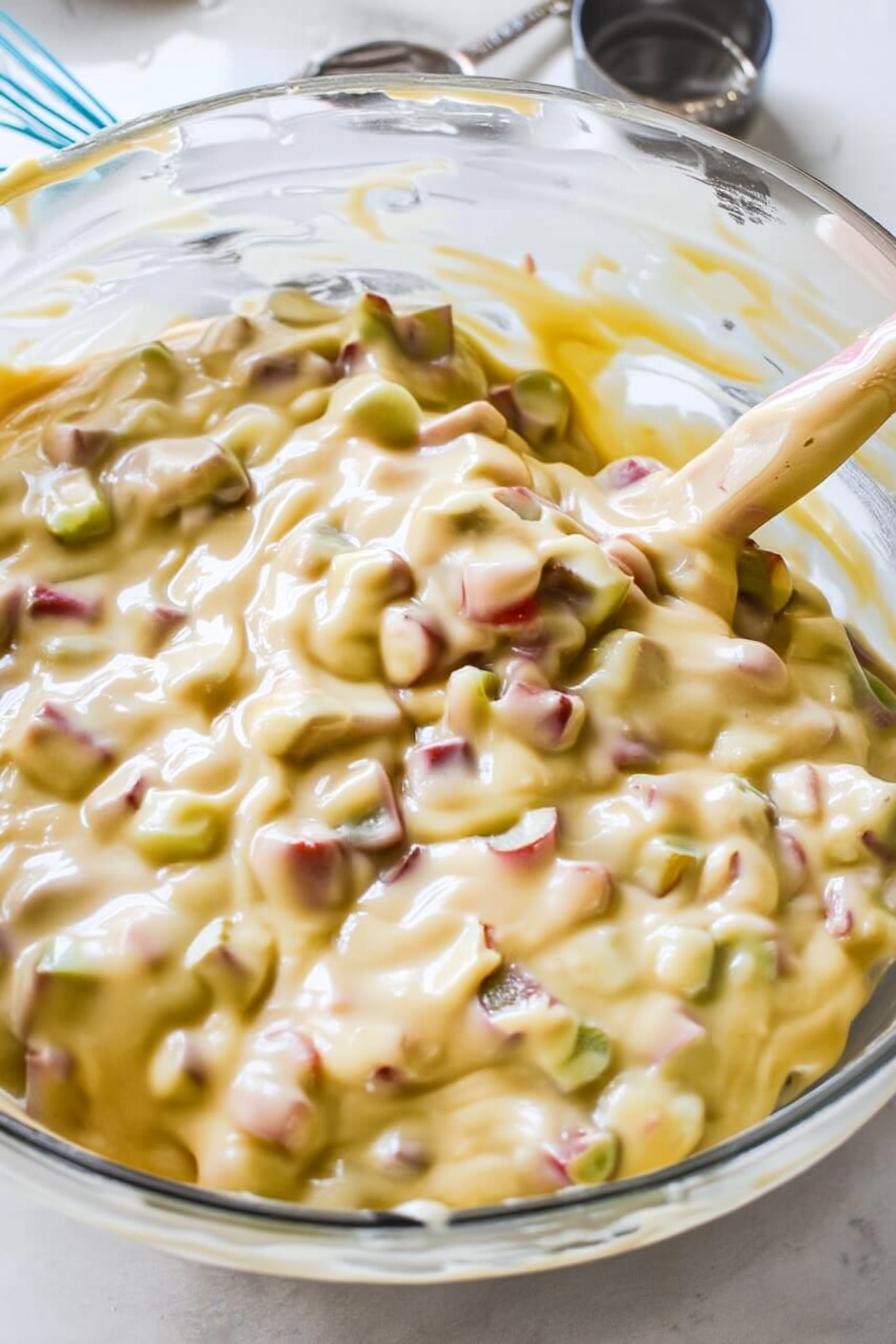 4. Add in the diced rhubarb, mixing until evenly distributed, then set aside.