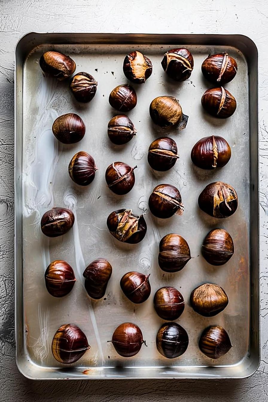 - Arrange the chestnuts in a single layer on a rimmed baking sheet. Pour ¼ cup water around, not over, to keep scoring visible.