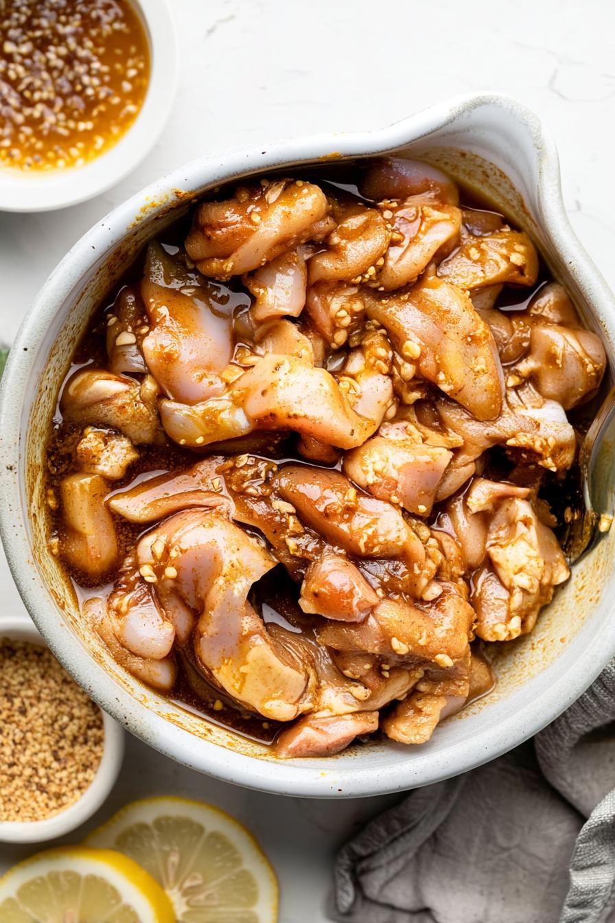 - Toss the chicken thighs in the marinade and ensure they are fully coated. Let them sit for around 15 minutes to absorb the flavors.