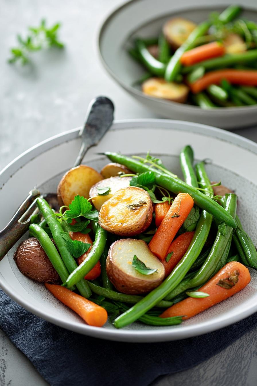 - In a large bowl, mix the chopped potatoes, green beans, and carrots with olive oil, ensuring every piece is coated; it should feel pleasantly oily.