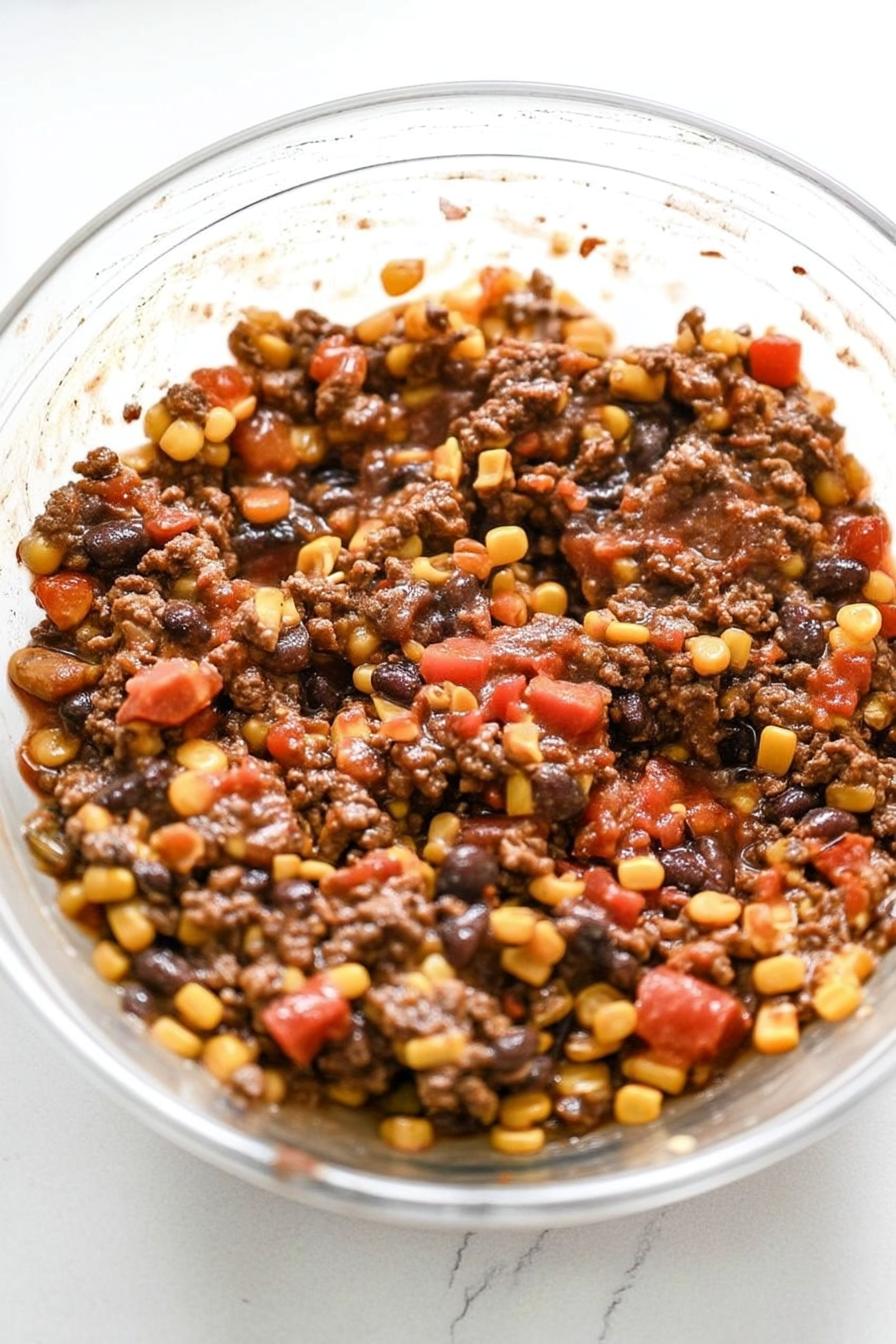- In a bowl, optionally mash the black beans with a fork for a creamier texture, then combine them with the corn, diced tomatoes, and the beef mixture.