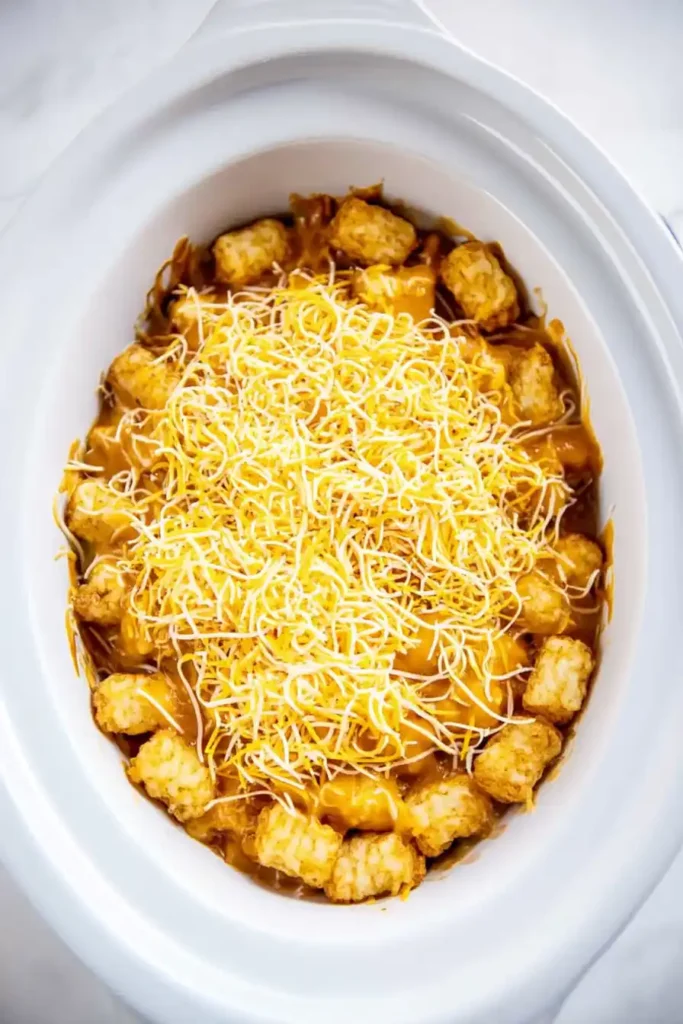 - Cook on LOW for 6–7 hours or on HIGH for 3–4 hours, until the tots are hot and edges turn golden brown, and you see soft bubbling around the sides. During the last 30 minutes, sprinkle 2 cups shredded cheddar on top, replace the lid, and let the cheese melt into a glossy layer.