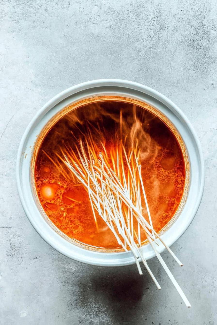 - Pour in 6 cups chicken broth and a 14.5-oz can diced tomatoes (with juices); bring to a simmer.