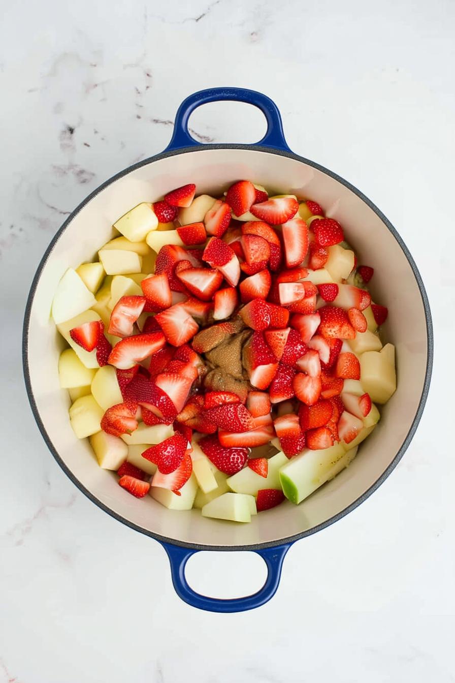 - Begin by adding the peeled and chopped apples, strawberries, and water to a large pot. Stir gently to combine, creating a medley of colors.